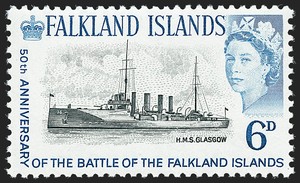 Editorial comment: Stefan Heijtz writes: The HMS Glasgow error is a 6d. postage stamp error produced for the Falkland Islands in 1964. The stamp issue commemorates the 50th anniversary of the 1914 Battle of the Falkland Islands and was a set of four stamps. The design error shows the incorrect ship, HMS Glasgow, instead of HMS Kent which was the ship shown on the normal 6d. stamps. HMS Glasgow normally appears on the 2 1/2d. stamps. Only one sheet of 60 stamps of the error was produced and it was sent to a stamp dealer in the United States who did not notice the mistake and distributed the stamps to his customers as part of normal sets. Only around 30 examples of the error have been discovered so far and it has a current market value of around £20,000 (in 2021).