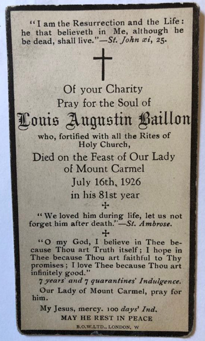 1. From the National Archives of the Falkland Islands - details of Louis Augustin 's father: Louis Augustin Baillon (Snr) was born 25 August 1815 in St Souplet, France. Louis and his brother Alexis were lace manufacturers and Alexis moved to Nottingham circa 1840. Louis was married to Eliza Catherine Blake, the second daughter of Dr Blake of Nottingham, on 25 July 1841 in Nottingham, England. Eliza was born in in 1917 in France to French/Irish parents. In 1844 Glover’s Directory of Nottingham listed Louis as having premises on High Pavement, a prominent address in Nottingham’s lace market. In 1862 Louis was living on Castle Gate and is also listed as Vice Consul of France. Circa 1870 Louis purchased Woodthorpe House on Mansfield Road, Sherwood, which was built circa 1800. In 1880 he sold Woodthorpe House and moved his family back to Nottingham to 1 Newcastle Drive, The Park. Louis and Eliza are recorded in the England 1851 and 1871 census as living in Nottingham. Louis died 14 November 1885 in Basford, Nottinghamshire and is buried in the graveyard of All Hallows, Gedling. The gravestone reads: Baillon Louis Augustin born 25 August 1815 at St. Souplet (Nord) France died 14 November 1885