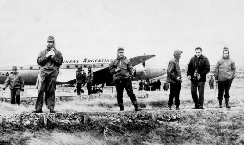On Wednesday, 28 September 1966 an armed group hijacked flight 648 of Aerolíneas Argentinas on its regular run from Buenos Aires to Río Gallegos and Ushuaia, and forced the pilot Ernesto Fernández García to fly off-course to the Falkland Islands. At 8.42am, the Douglas DC4, LV-AGG, landed on Stanley racecourse. The hijackers landed from the aircraft and hoisted seven Argentine flags, trying at the same time to keep the Islanders, who thought this was an emergency landing, away. The group delivered a formal statement in English (although addressed chiefly to the Argentine public) to reaffirm Argentine sovereignty over the Islands. They invited the Islanders to adopt Argentine citizenship, and renamed the Islands - Malvinas and Port Stanley - Puerto Rivero. They went on to seize seven hostages. At this, the Islands' authorities blocked in the aircraft using Landrovers.
