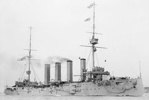 From October 1914 he was charged with the pursuit of von SPEE's East Asiatic Squadron which was moving across the Pacific with the Falkland Islands as a possible objective. Cradock hoisted his flag in the aged cruiser HMS Good Hope and arrived in Port Stanley in early October accompanied by three other warships.