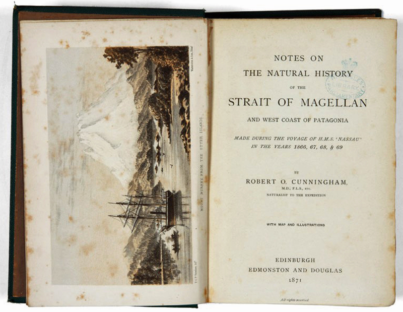 Robert Oliver Cunningham; Notes on the natural history of the Strait of Magellan and west coast of Patagonia made during the voyage of H.M.S. ʻNassau ̓in the years 1866, 67, 68, & 69. Edmonston and Douglas; 1871