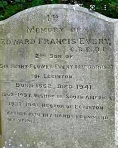Bishop Every died in Egginton on 16 January 1941 - the place where he had been born in April1862. His Bishop’s robes and Mitre are in a display cabinet within St.Wilfred’s Church, Egginton. On On his death the Bishop of Derby added to his obituary in The Times saying, "Above all he was, most obviously, one of the saints of the Most High: the trumpets will assuredly have sounded for him on the other side."