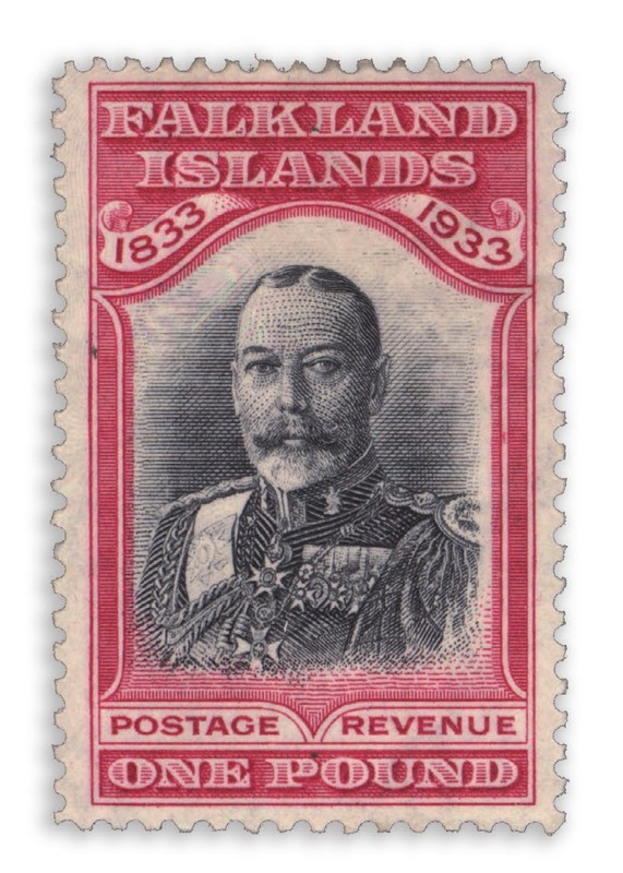 In 1933 the Falkland Islands celebrated the centenary of British administration of the islands and a set of stamps was produced to celebrate the occasion. The designer of the stamps was George ROBERTS, the Colonial Engineer. The King personally approved the designs, but he rejected the image of himself chosen for the £1 value. At his insistence the design that was eventually used depicted him in the full dress uniform of the Royal Highland Regiment of the Black Watch.