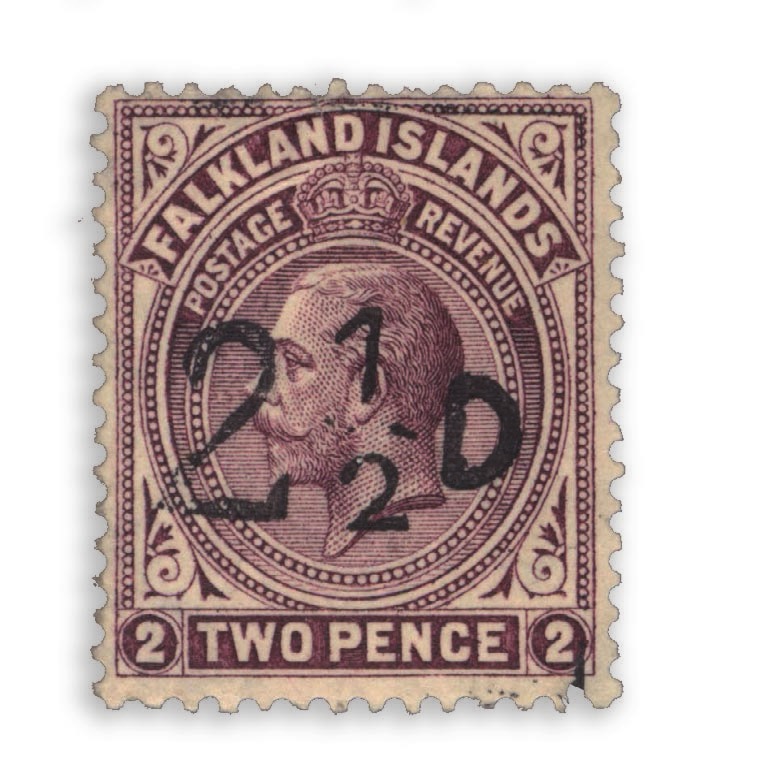 The King was an enthusiastic and knowledgeable philatelist, and postmasters in the Falkland Islands and on South Georgia were well aware of his interest in the hobby. In January 1928, when the stock of ½d and 2½d stamps held on South Georgia was exhausted, authority was given to surcharge the 2d with a 2½d (the foreign surface rate) with a locally produced handstamp. The handstamp was made at Leith Harbour and a total of 1179 were surcharged. The Postmaster in Stanley instructed his counterpart in South Georgia to 'preserve about 8 ... and a block of four for HM King George V.'