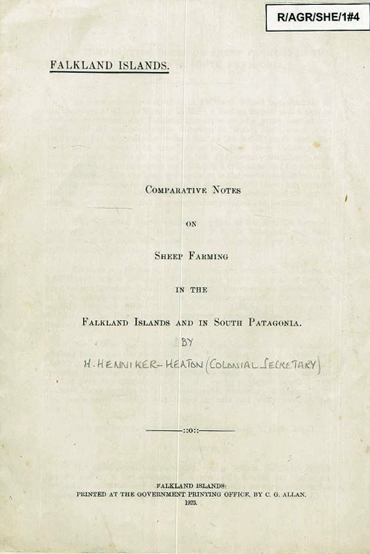 Henniker Heaton had also become interested in farming during his time in the Falklands and in 1923 the Government Printing Office published his Comparative Notes on Sheep Farming in the Falkland Islands and in South Patagonia.