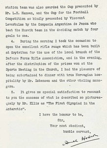 For the racing on 26th December Mr. Hodson entered his two horses 'Hurstwood' and 'Aravel', which he had purchased shortly beforehand from Mr. J. Robertson of Port Stephens, for several races and to the general delight was successful in carrying off two seconds and two thirds. His Excellency rode 'Hurstwood' in the Corinthian race, open to Falkland Islands bred horses ridden by their owners at weights of twelve stone and over, and came in second in a really thrilling finish. This sporting action on the Governor's part was most enthusiastically welcomed. It is surely rare indeed that a Governor of any Colony actually takes part in a race on level terms with all-comers and in this Colony it has created a precedent which we shall hope to see followed in future.