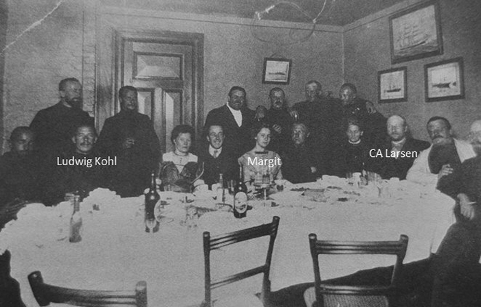 Instead of sailing further south Kohl had to stay at CA Larsen's home at Grytviken to recover from an appendicitis operation. Here he met Larsen's daughter Margit. Kohl left the Island on Harpon just before Christmas. During the next year he travelled through Norwegian Lapland up to Sweden.