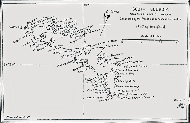 Further details of la Roché's voyage, taken from Seixas's account were published in 1813 by Captain James Burney in his authoritative A Chronological History of the Discoveries in the South Seas, published in five volumes between 1803 and 1817. La Roché sailed from Hamburg in 1674 in a vessel of 350 tons, accompanied by a bilander (a small two-masted merchant vessel) of 50 tons. On his return voyage la Roché called at the island of Chiloe to careen the two vessels and to take on provisions for their return to Europe. After the discovery of land, now identified as South Georgia, la Roché, according to his track on Dalrymple's chart steered due north and 'discovered' in 45°S a very large and pleasant island, where he remained for six days before continuing his voyage to Rochelle, where he arrived on 29 September 1675. This island, named Isla Grande and depicted on charts for many years, does not however exist. Burney points out the difficulties, conjectures and doubts which have arisen respecting la Roché's discoveries.