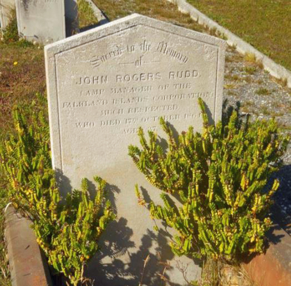 Camp manager, was born probably in or near Exeter in 1827. He came from farming stock and by 1844 he was resident in the Falklands and in the employ of John Bull WHITINGTON at Anson. By 1847 he was a shepherd at Fitzroy for Captain PACKE. He married Mary Ellen Roach in 1852, daughter of Edward Roach, one of the thirty Military PENSIONERS. Edward Roach had served in the British Army in Madras, where his two daughters were born. Rudd appears to have moved from the Packe farm at Fitzroy to work for the Falkland Islands Company soon after it received its Royal Charter in 1852.