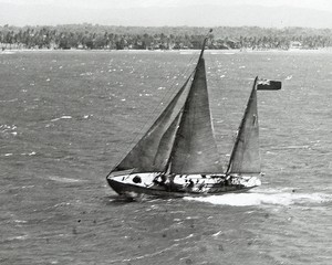 We were somewhat short-handed for the trip … but we kept up a steady 80-90 miles a day…During the night of 15 March … the boom end of the mizzen fell off, leaving the boom swinging wild. It was not easy to stop … it took three days to get things ship-shape again. And rather indicated that we were too short handed for emergencies of this nature … At dusk we could smell the peat smoke from Stanley, 70 miles up wind of us, and at daybreak the following morning, 24 March, we rounded Cape Pembroke … the wind was dead ahead … we found our progress stopped … it took us three hours to enter Port William and Stanley Harbour.The friendliness of the Falkland Islanders impressed us all, and greatly added to joy of our arrival. Presents of such things as eggs, milk, vegetables, and flowers … were showered upon us, and the hospitality and kindness throughout our stay in Stanley helped to make the time pass all too quickly. The day after our arrival we shifted berth to alongside the Government jetty … here we could enjoy a feeling of entire security which we had not known for many months