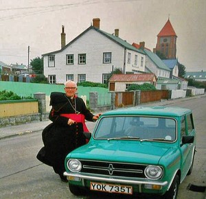 Graham Bound writes: 'I knew the old chap well and liked him a lot. He rode a small Suzuki motorbike around town in the early 70s and graduated on to a Mini. Neither mount was able to cope with his vast robes that billowed in the Stanley wind. That always made me smile ... I recall seeing The Monsignor being carried from the smoking shell of the hospital, and I was convinced then that he was dead. Happily he lived a bit longer, though. I think he was evacuated to the UK with my aunt Lena, who was badly burned. '