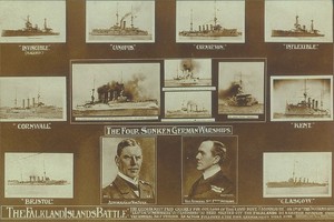 The defeat at Coronel, which resulted in the loss of HMS Good Hope, Admiral CRADOCK's flagship and HMS Monmouth, was the first sustained by the Royal Navy for over a century. Fisher blamed Sturdee for the defeat which was, however, surrounded by controversy. Admiral Graf von SPEE's German East Asiatic Squadron, which inflicted the defeat, was based at Tsingtao, China, at the outbreak of war in August 1914 and was ordered to proceed to the Pacific although one of his ships, the Emden, was detached to attack Allied shipping in the area, which it did very successfully. Von Spee's remaining squadron comprised the armoured cruisers Scharnhorst (the flagship) and the Gneisenau and the light cruisers Nurnberg, Leipzig and Dresden. The ultimate destination of the squadron was the west coast of South America where there was a strong German presence and much pro-German sentiment.