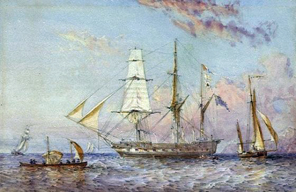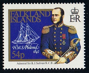 On board the Beagle Sulivan made two visits to the Falklands in 1833 and 1834. On her return to England in November 1836, at the end of her round the world voyage, Sulivan was placed on half-pay. On 14 January 1837 he married Sophia, the third daughter of Vice-Admiral James Young; eight children were born to the couple. In December of that year he was appointed in command of the schooner Pincher for service on the west coast of Africa, but a few weeks later, again at the recommendation of FitzRoy, he was appointed in command of the cutter Arrow to carry out surveys in the Falkland Islands. Sulivan arrived in Berkeley Sound on 15 October 1838. In spite of poor health he surveyed Port William, Stanley Harbour and Port Harriet, followed by Port Fitzroy, which he named after his former commanding officer, Port Pleasant and Kelp Lagoon, the eastern part of Choiseul Sound and nearby inlets. At the end of the southern summer Sulivan made for Río de Janeiro, from where he was invalided home, arriving in England in June 1839. The fact that he was attacked in the Falklands by a wild cow and severely shaken must have affected his health. Lieutenant William Robinson of the Stag, wearing the broad pennant of Sulivan's father, Commodore Thomas Ball Sulivan, was appointed to the Arrow in his place. Sulivan was awarded £100 for his work in the Arrow. On his return to England, Sulivan wrote an account of the climate and soil of the Falkland Islands, which was published in The Nautical Magazine in 1841. His second in command, Lauchlan Bellingham MACKINNON also wrote an account of the Arrow's six months in the islands.