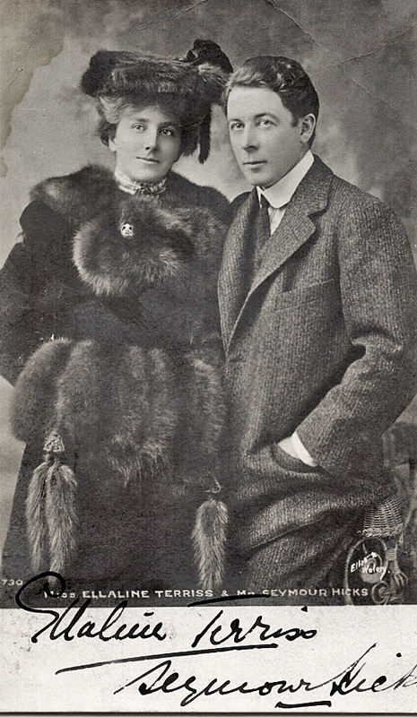 In 1891 she met a young actor named Seymour Hicks (1871-1949) who proposed to her eight days later. Refused permission to marry by her father, they eloped. The wedding was less than romantic. Two witnesses, slightly drunk, were plucked off the street for a fee of half a crown each, and the wedding breakfast - for two - was Irish stew and Burgundy.